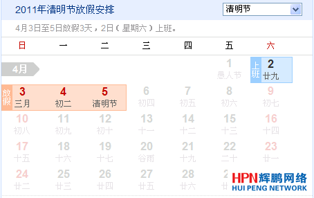 根據(jù)《國務院辦公廳關于2011年部分節(jié)假日安排的通知》(國辦發(fā)明電〔2010〕40號)精神,4月3日至5日放假調(diào)休,共3天。4月2日(星期六)上班。放假期間,請各部門做好安全檢查。
