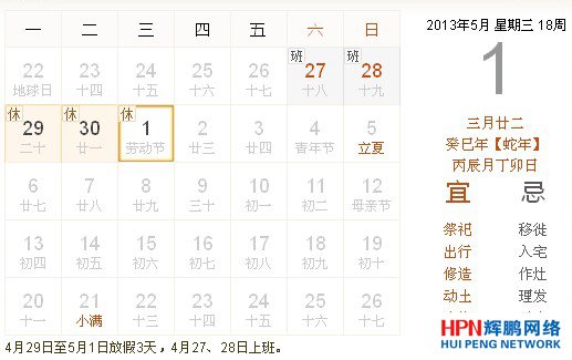 2013年放假時間:4月29日-5月1日放假調(diào)休,共3天