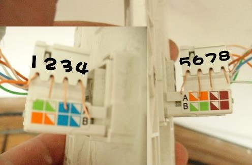 在正品網(wǎng)線插座上,8個(gè)接線卡口除了有標(biāo)明568A標(biāo)準(zhǔn)和568B標(biāo)準(zhǔn)兩種連接方式的色標(biāo)外,還有標(biāo)明每個(gè)內(nèi)部接線端與前端針腳的對(duì)應(yīng)序號(hào),而且插座上的各種色標(biāo)均非常清晰、極好辨認(rèn)。在接線時(shí),你只須將雙絞線中的各色線對(duì)打入對(duì)應(yīng)色標(biāo)的卡口即可。