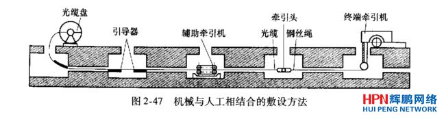 (2)光纜管道敷設(shè)方法光纜的管道敷設(shè)方法主要有機械牽引法、人工牽引法,以及機械與人工相結(jié)合的敷設(shè)方法。