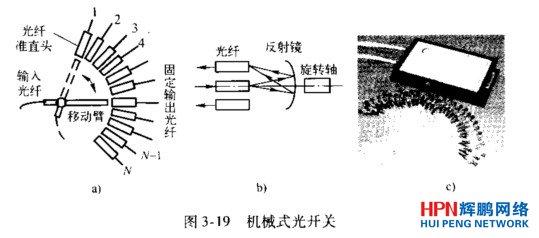 微機(jī)電系統(tǒng)光開(kāi)關(guān)可分為移動(dòng)光纖式光開(kāi)關(guān)、移動(dòng)套管式光開(kāi)關(guān)和移動(dòng)透鏡(包括反射鏡、棱鏡和自聚焦透鏡)式光開(kāi)關(guān)。表示l×Ⅳ移動(dòng)光纖式光開(kāi)關(guān),它用電磁鐵驅(qū)動(dòng)活動(dòng)臂移動(dòng),切換到不同的固定臂光纖一圖3 19b表示1×2移動(dòng)反射鏡式光開(kāi)關(guān)。